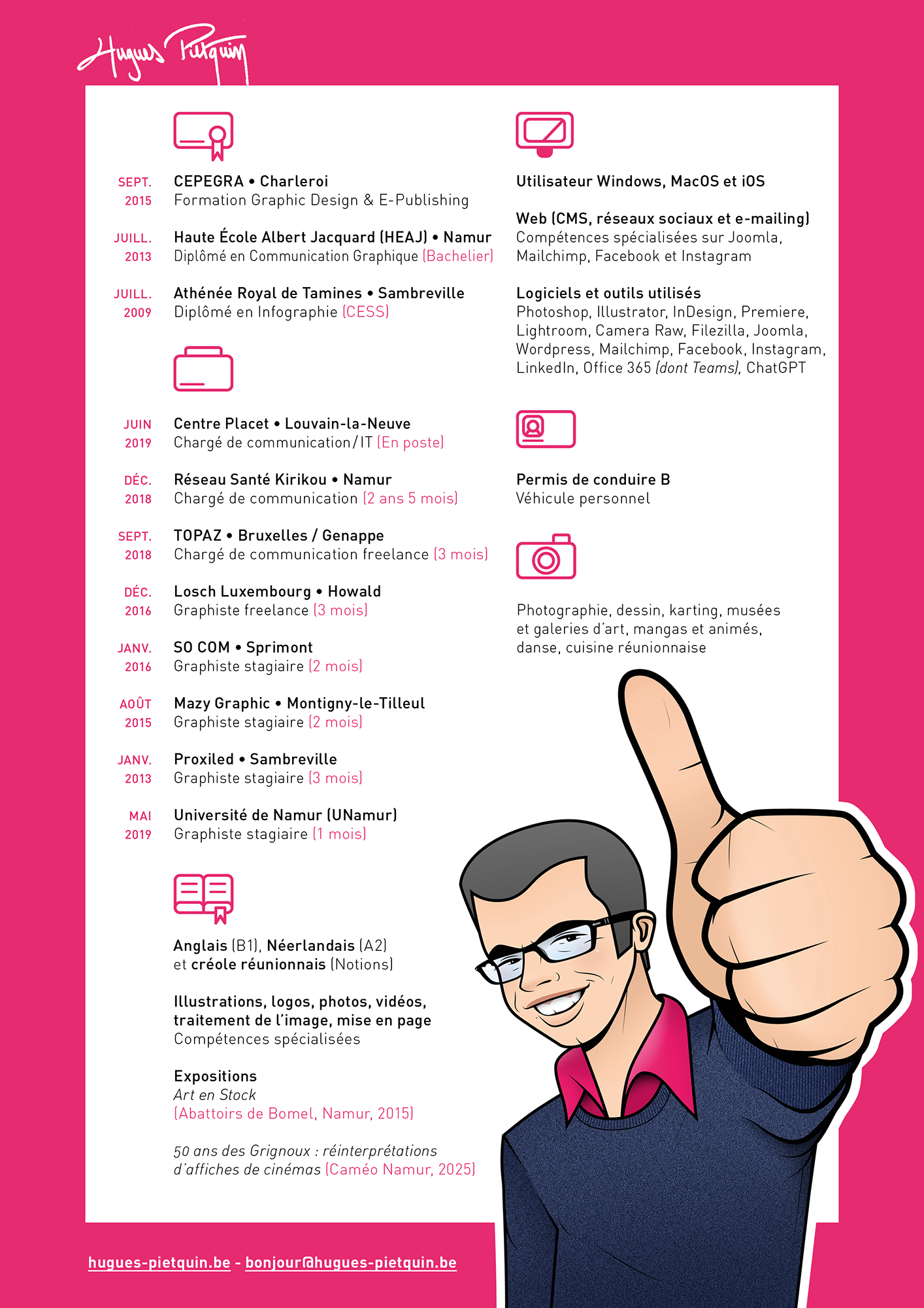 Mon profil est consultable sur LinkedIn et j'expose mes illustrations personnelles sur Instagram.